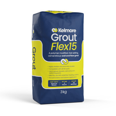 Kelmore’s Grout Flex15 is a highly flexible, polymer modified, fast setting, cementitious grout for walls and floors.