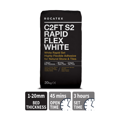 ROCATEX C2FT S2 Rapid Flex White is a single part, highly flexible wall and floor tile adhesive for fixing natural stone and tiles including ceramics, porcelain and mosaics to a variety of substrates. Suitable for interior and exterior use.